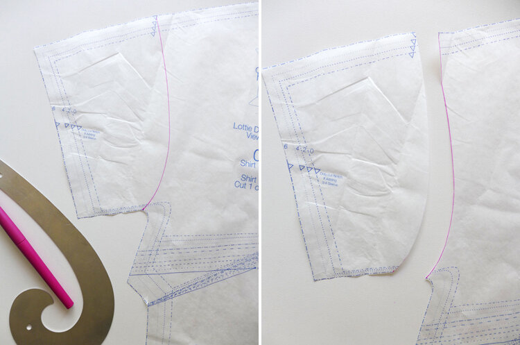2. As mentioned above, the unique element of the Lottie in relation to bust adjustments is that it has a dolman sleeve. Not to worry! Starting on the shoulder seam, use a French curve to draw a faux armscye to right where the curve begins under the arm. Carefully trim the sleeve off and set aside. We need it out of the way to make our adjustments to the bust. But we will need it again later to reattach.